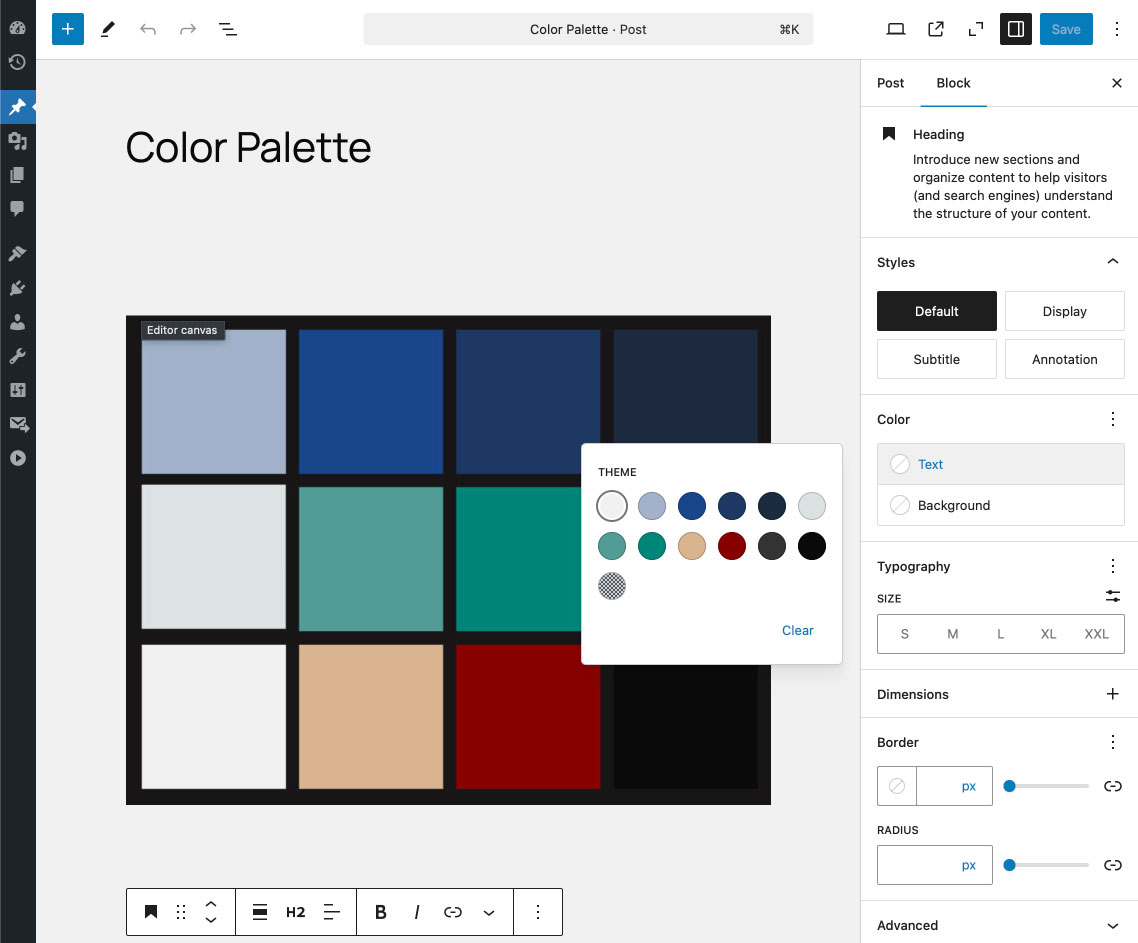 I’ll work from this palette on the redesign although I may run into cases where I need to an additional color. After the staging is up for preview, I’ll limit the editor.